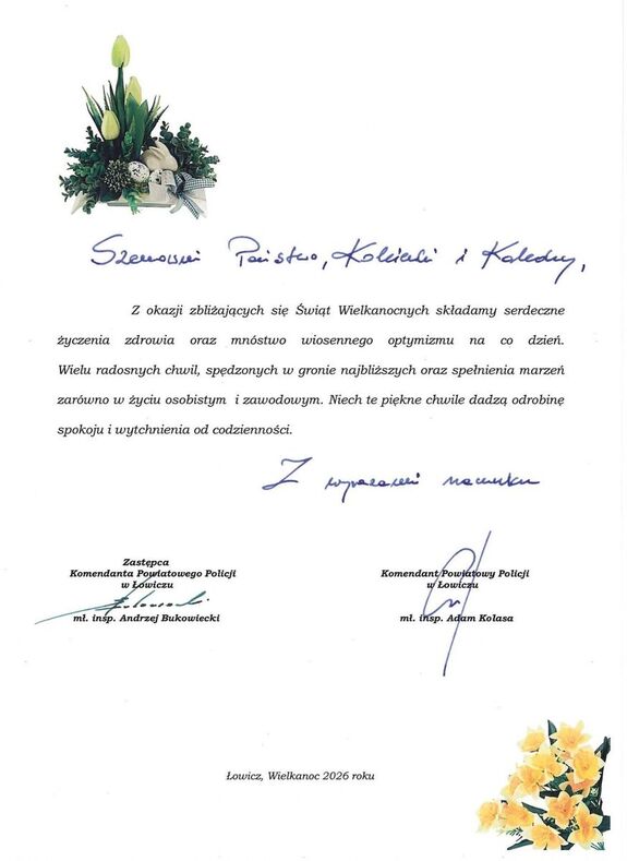 "W tym wyjątkowym okresie Wielkanocy, chciałbym skierować do Państwa życzenia i podkreślić, że Wasza codzienna służba i praca jest niezastąpionym wkładem w bezpieczeństwo i porządek naszego regionu. Dziękuję za zaangażowanie, profesjonalizm i poświęcenie, które pokazujecie każdego dnia. "