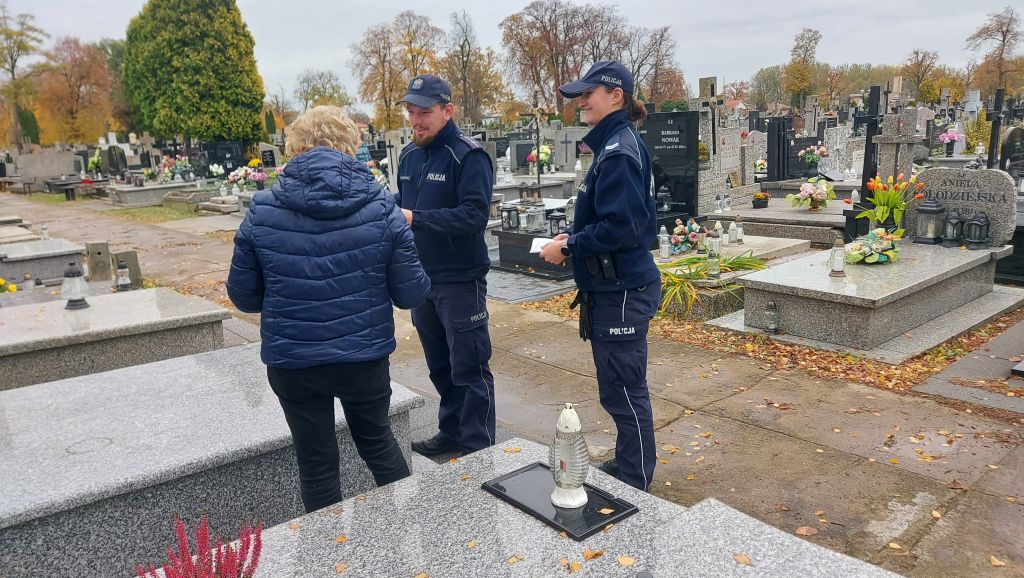 Łowiccy dzielnicowi w trosce o bezpieczeństwo osób porządkujących groby, prowadzą działania prewencyjne w rejonach cmentarzy, ostrzegając seniorów przed złodziejami i rozdają ulotki.