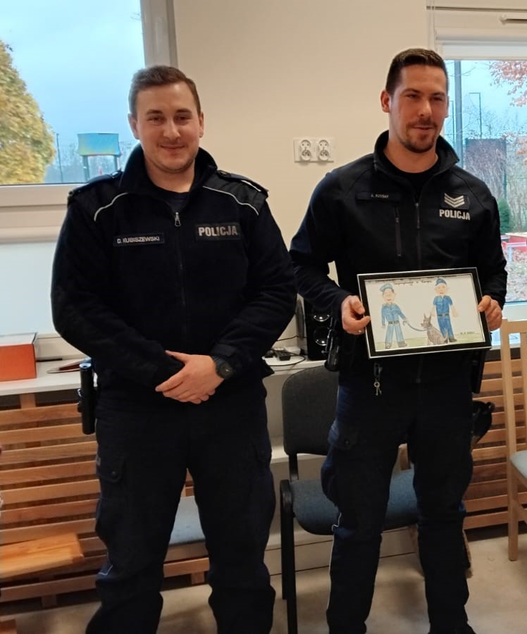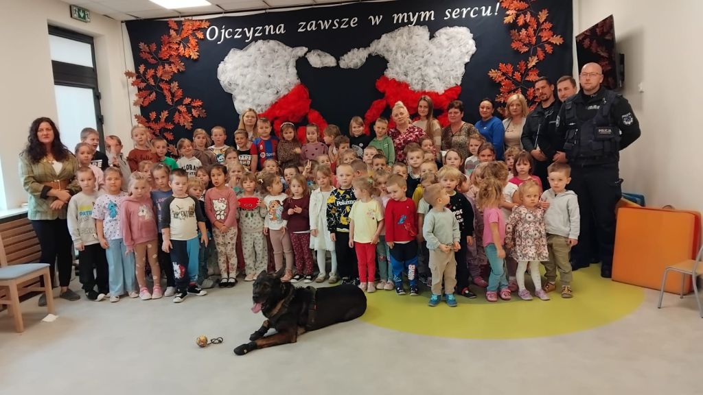 Dzielnicowi z Komendy Powiatowej Policji w Łowiczu sierż. sztab. Aleksander Rześny i st. sierż. Dominik Kubiszewski 12 listopada 2025 roku odwiedzili przedszkolaków w Kiernozi. Przedszkolaki bardzo miło powitały funkcjonariuszy. Wraz z dzielnicowymi przybył na spotkanie asp. Radosław Pawlata – przewodnik ze swoim psem służbowym, co wywołało dużo uśmiechu na twarzach maluchów. Policjanci zapoznali dzieciaków z podstawowymi zasadami bezpieczeństwa na drodze, apelowali, aby nosić elementy odblaskowe. Zwrócili również uwagę na bezpieczeństwo w codziennych sytuacjach, zalecali ostrożność w kontaktach z osobami obcymi i kiedy ktoś nieznajomy nas zaczepia. Należy pamiętać aby w sytuacjach zagrożenia prosić o pomoc dzwoniąc na numery alarmowe. Spotkanie miało również na celu zapoznanie się z osobą policjanta i jego pracą. Przewodnik psa służbowego opowiadał o szkoleniu psów służbowych, odbył się pokaz z udziałem czworonoga. Policjanci pokazywali przy okazji jak uchronić się przed atakującym psem, w takich sytuacjach należy być bardzo ostrożnym, nie zaczepiać zwierząt. Dzieci był aktywne, zadawały dużo pytań. Na zakończenie funkcjonariusze otrzymali bardzo miłą pamiątkę, wykonany przez dzieci rysunek policjantów z psem służbowym.