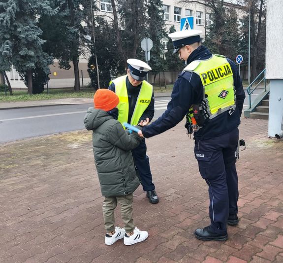 Z okazji Mikołajek policjanci z ruchu drogowego w pobliżu budynku Komendy Powiatowej Policji w Łowiczu rozdawali napotkanym przechodniom elementy odblaskowe, aby niechronieni uczestnicy ruchu drogowego byli lepiej widoczni i bezpieczni na drogach.